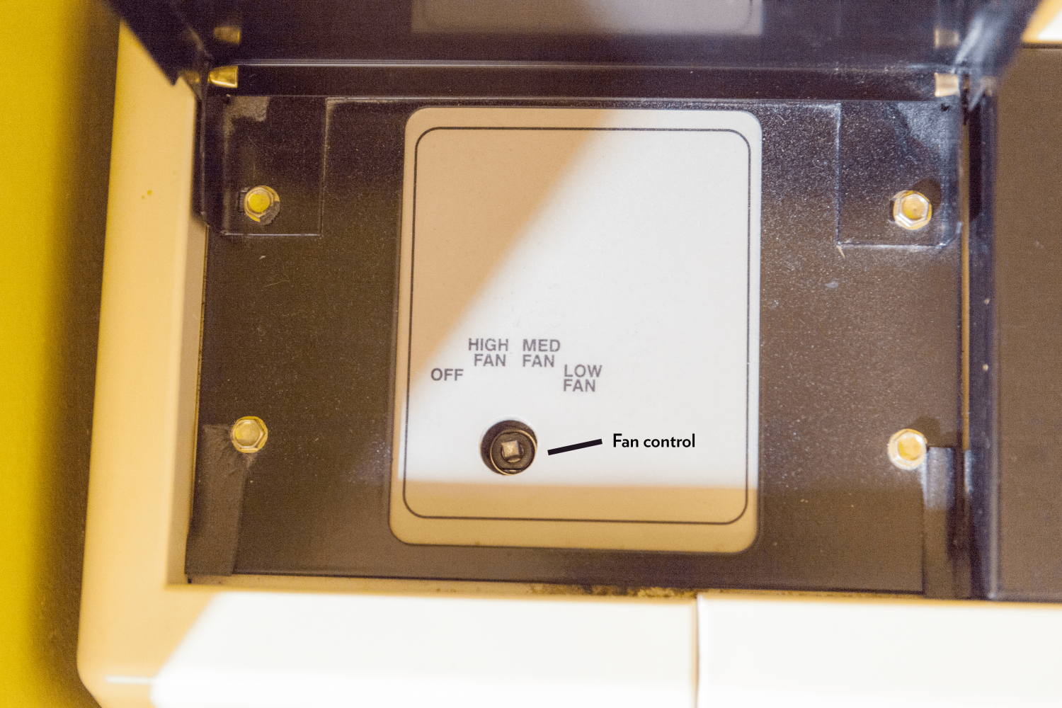 In Merit, heat is provided via hot water and cooling via chilled water through a radiator near your window. Your room’s temperature can be set from 65 – 75 °F and can be changed via a thermostat located on the wall (see photo). Pushing the “up” arrow on the left of the thermostat will warm your room, while pushing the “down” arrow will cool your room. Fan speed is controlled via a switch located under a hinged cover on the upper left corner of the convector unit (see photo). To increase or decrease fan speed, turn the control switch under the hinged cover on the convector unit to the desired setting.